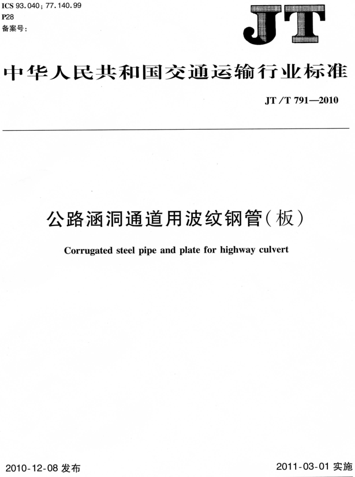 交通部《公路涵洞通過(guò)波紋鋼管(板)》JT/T791